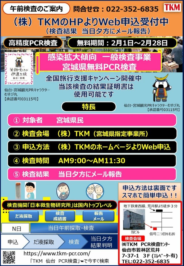 【(株)TKM宮城県無料PCR検査】のご案内 ❤️❤️【期間延長】2/1(水)~2/28(火)❤️❤️ 旅行支援割利用のお客様はオススメ 【アクセス】仙台市地下鉄 荒井駅南口徒歩3分 ?️駐車場完備 【申込】㈱TKMのHPから【無料PCR検査申込】クリック ?直接ご来社でも予約取れます 【問い合わせ】㈱TKM ☎022-352-6835