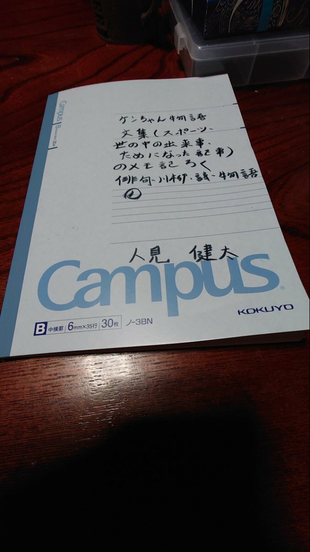 ケンちゃん物語?? 私の趣味である文筆活動の底上げと幅を広げる目的としてスポーツ、世の中の出来事、ためになった記事の下書きレポート、俳句 川柳 詩 物語の下書きをするノートを買ってきました。早速今日から使っています。このノートに書いた下書きはパソコンと筆字で清書して作品にします。 2023.02.21 人見 健太 @probaseballspl1