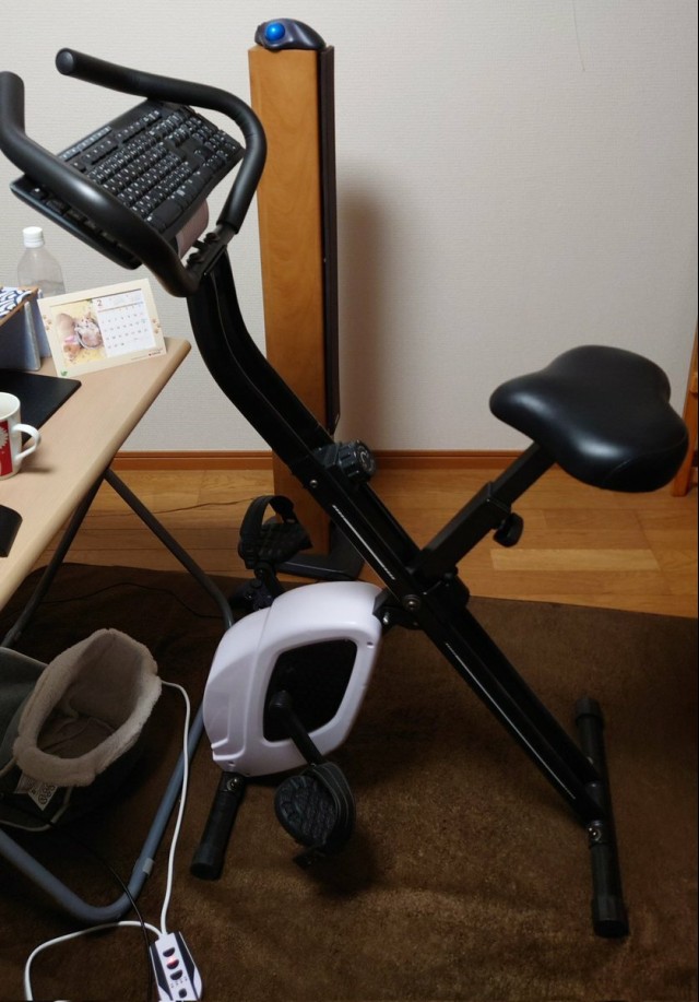 ダイエットのマストアイテム、ルームバイク。折り畳みの軽量モデルで1時間漕げる優れもの。スピーカー上にトラックボールマウスを置けば しながらダイエット♪ 2023.02.26 てん・すてぃっく@だてまき28号 @tenstick