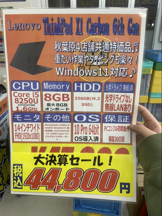 今週の秋葉原4店舗共通セール! ②【ThinkPad X1 Carbon 6th】 第8世代i5搭載の、ThinkPadフラッグシップモデル!! 狭額縁ベゼルのスタイリッシュなデザイン、Type-C充電、IPSのFullHD液晶と、死角なしの1台? ?Windows11対応? 在庫は80台! 2023.03.02 PCコンフル秋葉原4号店☆中古PCショップ @PCcomfullAKB4