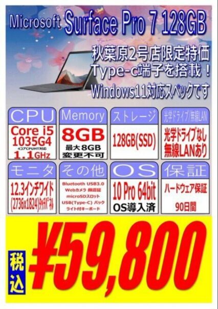 グッズ 【秋葉原2号店限定特価品】 Surface Pro 7 128GB 第10世代Core i5搭載! 大人気のお洒落タブレットが限定入荷! type-c端子の充電にも対応(65W)して、超便利に? 今回はキーボードカバーも付きます! 税込59,800円 在庫は3台のみ!