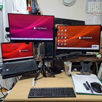デバイス 配置をいろいろと検討して、大きなディスプレイは一番左上 ノートパソコンはその下 右のタッチパネルディスプレイは図を描いたり設計用 そして、ポールのすぐそばには携帯の三脚で右には、アナログノートパッドをセットしました。一つ一つ机の上に置いたらいっぱいになるからね。