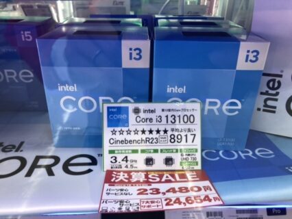パソコン こんにちは! アプライド広島西店です! CPU Core i3 13100入荷しております!! 通常使用には申し分ない性能のCPUで、お仕事でもサクサク!! コスパのいいパソコンを組みたい方にオススメのCPUです! ぜひご来店ください!!
