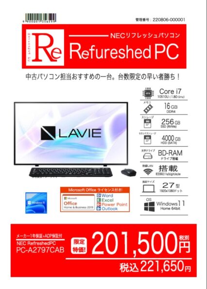パソコン NECの便利で快適な一体型PCを入荷しました! ブルーレイもOK?、画面大きい?、 しかも3年保証付き!! 是非店頭までおこしください?