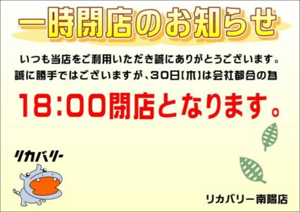 パソコン こんにちは、リカバリー南陽店です。 本日30日は会社都合の為、18:00閉店となります。 ご相談などがございましたらお早めにご来店下さい。 なお、明日は通常営業になります。