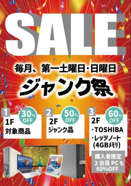 パソコン 【店舗からのお知らせ?】 明日より2日間限定で「ジャンク祭」を行います? 2階商品全て50%OFF 1階商品は最大30%OFF とお買い得商品を多数取り揃え 皆様のお越しをお待ちしております。 この機会をお見逃しなく?