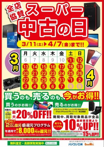 パソコン 本日3月11日から4月7日まで【スーパー中古の日】開催中! 対象の中古商品が最大20%OFF!! 中古パソコン、中古モニタ、中古PCパーツなど、とてもお値打ちになっています! 良い商品から売れちゃいますので、お早めにご来店くださいませー!