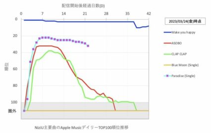 メーカー NiziU・5thSg 表題曲 Paradise (Single) == Apple Music TOP100 配信 : 20→21→22日目 @ 03/24金 順位 : 28→29→32 [最高22] 圏内21日 Ri 1480点 == Apple Music トップソング 配信 : 20→21→22日目 @ 03/24金 順位 : 30→34→38 [最高22] 圏内22日 Ri 3689点