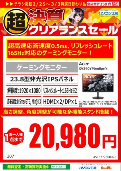 メーカー オススメセール品 XV240YPbmiiprfx ¥20,980 GB2590HSU-B2 ¥30,980 どちらも高リフレッシュレート!! 高さ調整可能なスタンド! 展示もございますので店頭でぜひご確認ください