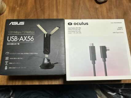 メーカー ASUS AX56 USB wifi子機 と VR充電切れない用にC to Cのquest純正ケーブル買いました どっちもvrchat用なのが闇 とりあえず今日は有線接続したけど画質もくっきりになって焦った ケーブルが固いからちょっと引っ張られ感あるけど良い買い物