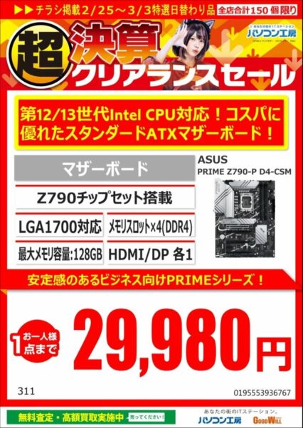 メーカー ?セール商品ピックアップ? 本日3月3日(金)まで 【ASUS PRIME Z790-P D4-CSM】を 「¥29,980」でご提供しております! セールは今日までとなっておりますのでこのお得な期間に是非当店までお買い求めください!