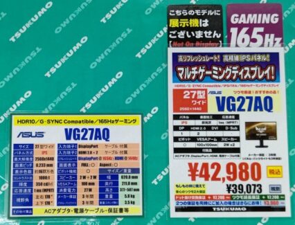 メーカー 【本店ⅡBF】 ~商品紹介~ 27インチ WQHD(2560×1440) IPSパネル 165Hzゲーミングディスプレイ ASUS『VG27AQ』税込42,980円 取り置きサービスはこちら? . 2023.02.07 メーカー